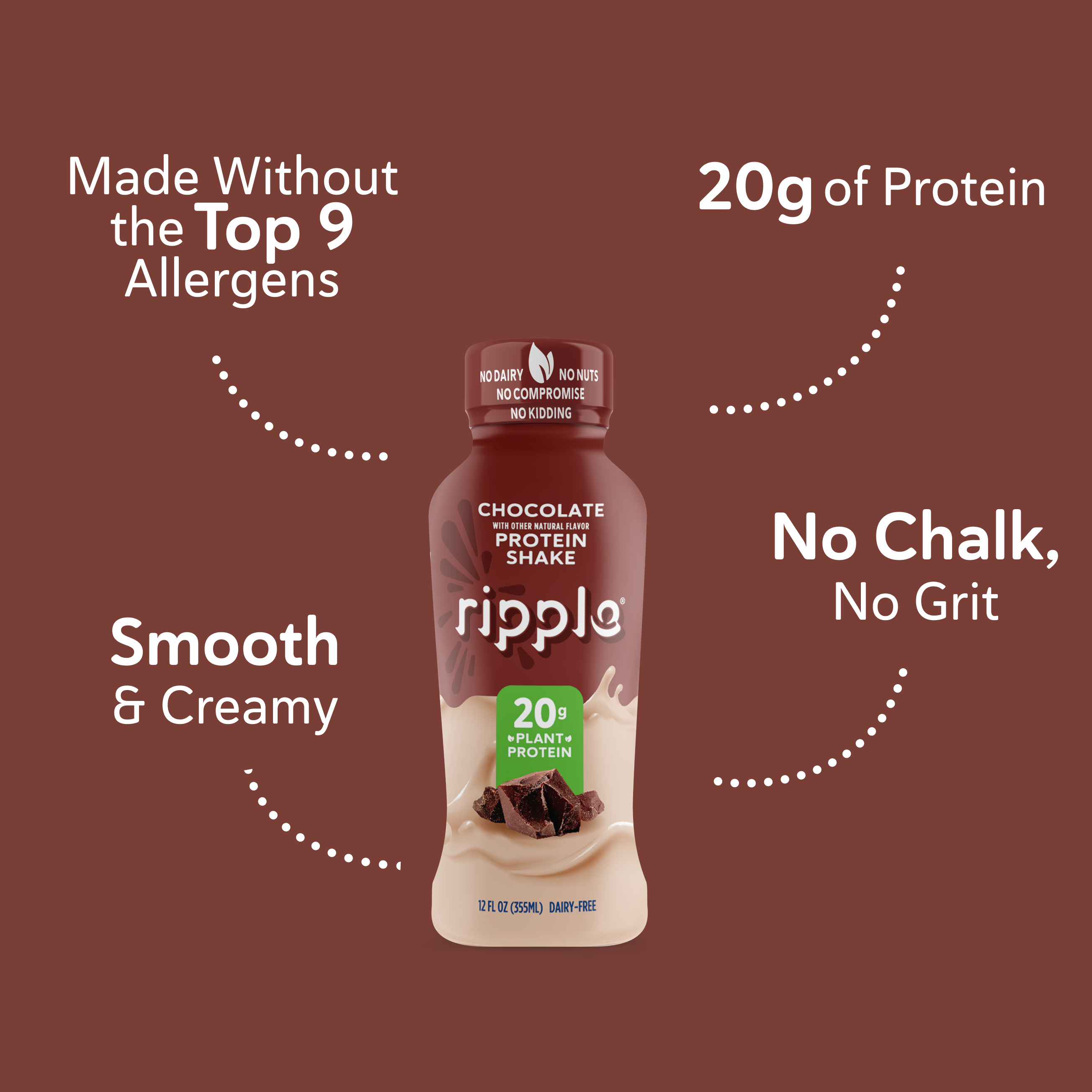 Fuel Life… Deliciously: No more gritty protein shakes. Ripple Nutrition Chocolate Protein Shake is delicious. smooth. with rich cocoa and is packed with nutrition. Each bottle has 20g of plant-based protein. 30% of your daily value of iron and only 9 grams of sugar.